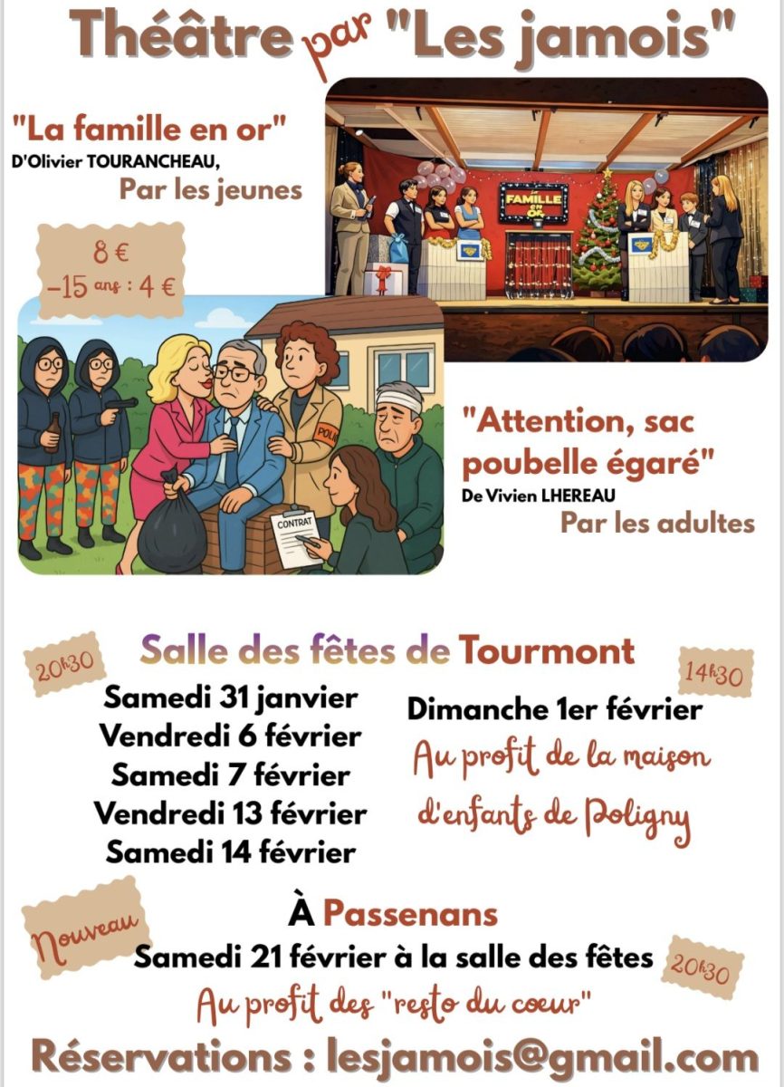 A la salle des fêtes de Passenans, le samedi 21 février à 20h30, au profit des resto du coeur.