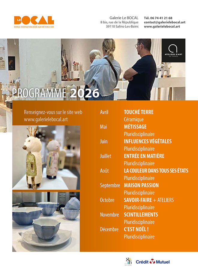 Le Bocal est un lieu d’exposition dédié aux métiers d’art. Sa programmation, d’avril à décembre, propose tous les mois un thème différent pour une mise en lumière des multiples facettes de l’artisanat.