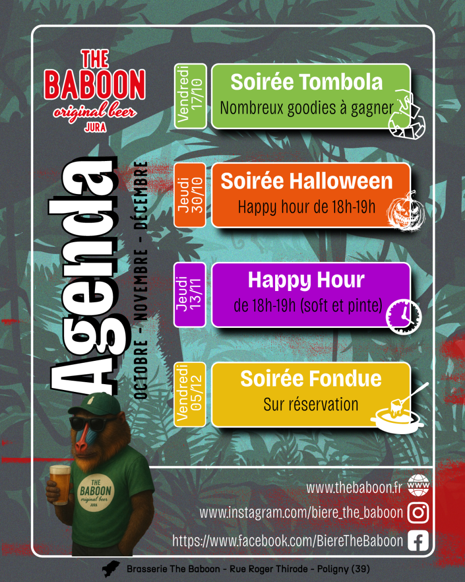 Venez profiter de l’ambiance Baboon dès 16h du mercredi au vendredi, installez-vous et savourez nos pintes dans un cadre unique. Nous vendons également du vin et des jus (locaux) ainsi que des softs (sodas et sirops).