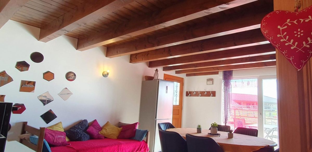 Cette ravissante « maison jumelée » qui regroupe deux gîtes (G2260 et G2261) vous accueille au cœur d'un domaine équestre de 9 hectares, dans un cadre naturel exceptionnel et où les animaux de la ferme (chevaux, poneys, chèvres, lamas...) évoluent en toute quiétude et pour le bonheur des amoureux de la nature. Aménagée avec goût et spacieuse (capacité d'accueil total d'environ 9 personnes), vous profiterez d'un réel confort grâce aux installations mises à votre disposition : cuisine équipée (l'une des deux pièces à vivre ainsi que la terrasse peuvent accueillir un groupe de 12 personnes pour les repas), douche à l'italienne, terrasse spacieuse.... (Informations supplémentaires et détaillées - cf annonces G2260 et G2261). Notre gîte se situe entre monts et vallées, ce qui vous offre le loisir découvrir des sites nommés “plus beaux villages de France” (Château-Chalon, Baume-les-Messieurs), des villages pittoresques ( Poligny ville du Comté ; Arbois – son musée et ses vins ; Salins-les-Bains – ses thermes et fortifications ; Dole – la Venise Jurassienne ; Arc-et-Senans et ses salines classées au Patrimoine Mondial de l'UNESCO...), la région des lacs (Chalain...) et des cascades (du Hérisson, des Tufs...) Possibilité de pratiquer diverses activités : randonnée à pieds, vélo, VTT... (départ depuis le gîte sur des pistes IGN), balades à poneys (activités proposées au sein de notre domaine dans le cadre de notre activité de "Ferme Équestre Élevage Juan"), piscine et thermes, lacs, visite de sites touristiques et culturels... ou tout simplement profiter de notre domaine pour vous reposer sur le temps d'un week-end ou durant quelques jours de vacances Animal de compagnie acceptés gratuitement et dans le respect de la charte d'accueil des animaux de Gîte de France (un par logement – accueil supplémentaire avec accord des propriétaires). Une caution de 300 € par animal vous sera demandée. Pour charge de véhicule électrique un surcout sera demandé (voir avec la propriétaire)