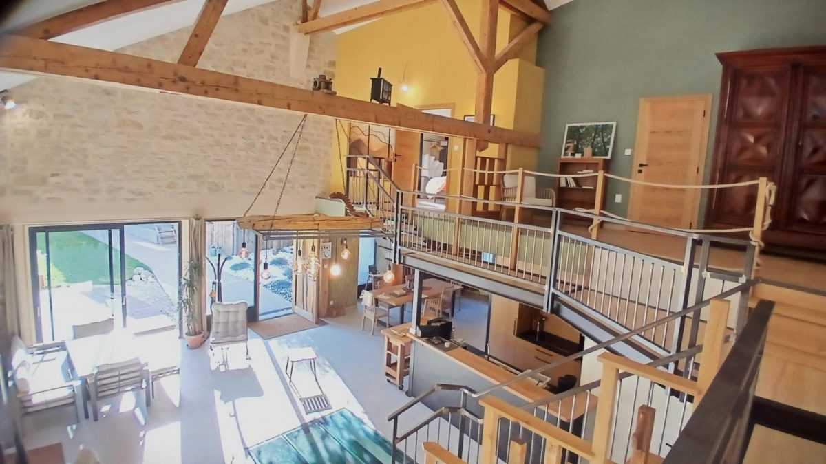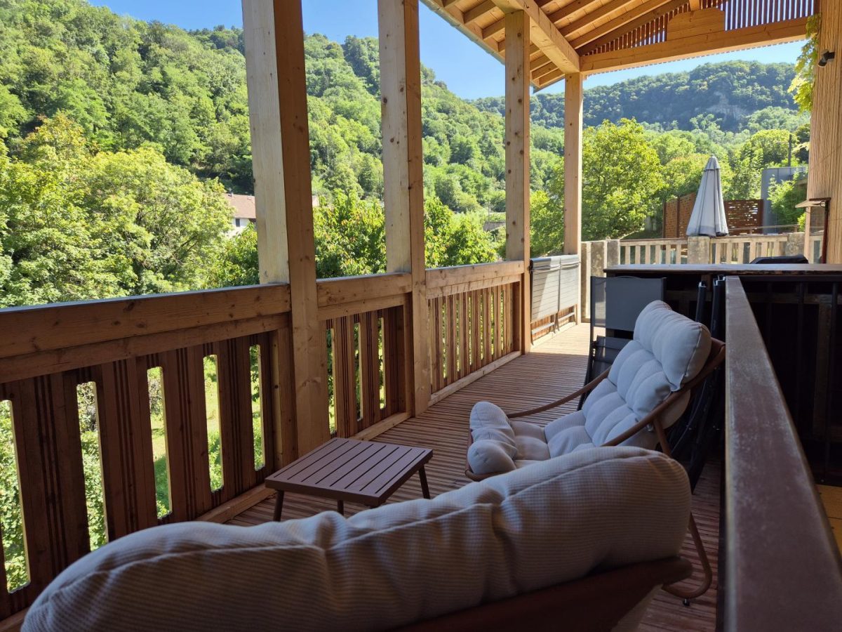Située au pied d'une reculée, à quelques pas du centre-ville, la propriété séduit par son ambiance champêtre. Vous y trouverez jardins, verger, canal et rivière. Entièrement aménagé en 2024 dans un ancien atelier de menuiserie construit sur un vieux moulin, le gîte vous accueille avec un grand espace séjour ouvert et lumineux de 90 m² surmonté de mezzanines. Cet espace comprend salon, salle à manger et cuisine, Il donne vue sur la roue du moulin en sous-sol. Vous mettez en mouvement cette dernière à votre guise. Le gîte étant prévu pour 14 personnes, les chambres et commodités mises à disposition pour 8 personnes sont fonction de la composition du groupe et de ses desiderata, jusqu’à 4 chambres et 3 ou 4 salles de bains. Le rez-de-chaussée du gîte propose deux chambres : l'une avec un lit double (160 cm), l'autre avec deux lits simples modulables, ainsi que deux salles d'eau et deux WC. À l'étage, quatre chambres peuvent accueillir jusqu'à 8 personnes (un lit double de 180 cm et six lits simples modulables), avec trois salles d'eau et un WC indépendant. À l'extérieur, une terrasse en bois donne sur la pelouse, une autre surplombe le verger, offrant une vue panoramique sur la propriété et le paysage. La galerie nord, suspendue et couverte, est idéale en été pour sa fraîcheur. Elle donne sur la rivière et le relief en vis-à-vis. Vous aurez accès au verger, aux cheminements sur la propriété, à un bassin, au ruisseau qui longe le moulin, aux berges d'une rivière peu profonde et au petit canal qui traverse la propriété. Ce gîte est situé en bordure de la route qui mène aux lacs et aux stations de ski. Le tarif de la location inclut une consommation électrique "raisonnable" incluant le chauffage. Le propriétaire se réserve le droit de demander en fin de séjour un supplément basé sur la consommation réelle et n'excédant pas 120 €.