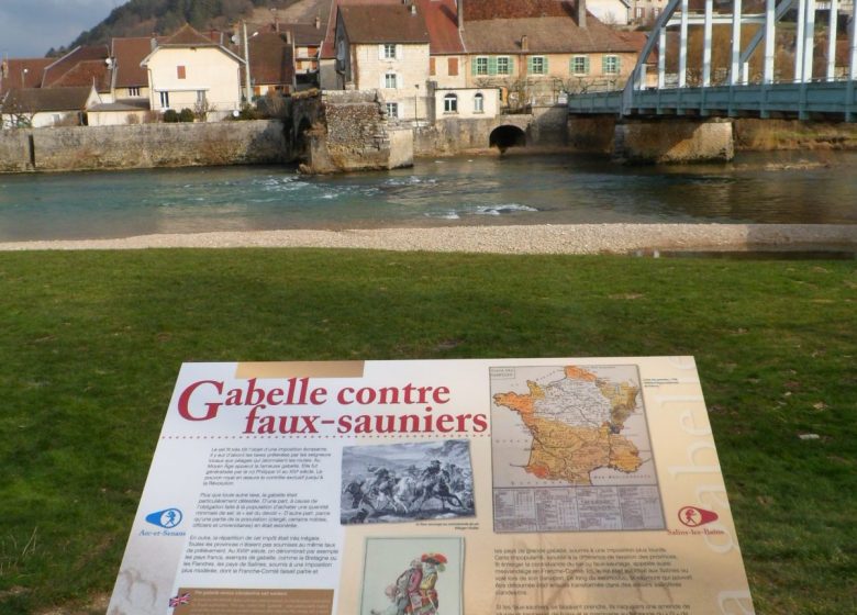 Le Gabelou était un douanier chargé de la surveillance du sel. D'où le nom de ce sentier balisé (balisage jaune) de 29,5 km pour randonnée et VTT reliant Salins les Bains et Arc et Senans.