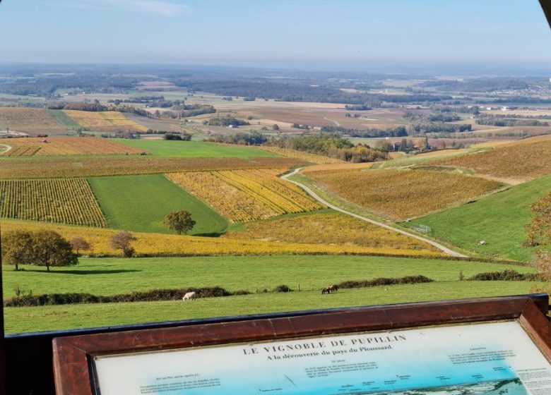 Un belvédère avec son aire de pique-nique, son kiosque d'observation et sa table d'orientation d'où vous aurez une vue panoramique sur le vignoble de Pupillin et la plaine jurassienne.