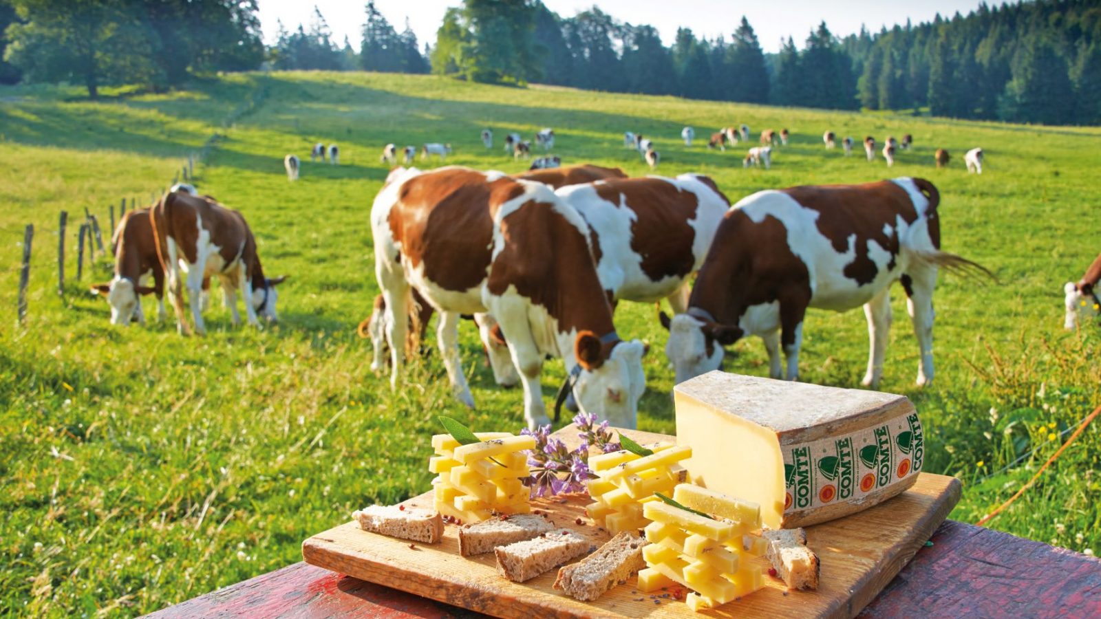 Le Comté bénéficie d’une Appellation d’Origine Contrôlée (AOP) depuis 1958 et d’une Appellation d’Origine Protégée (AOP) depuis 1996. Chaque année, des vaches de race Montbéliarde et Simmental produisent 66500 tonnes de lait pour fabriquer du Comté. Ce qui représente environ 1 650 000 meules. Et quand on sait qu’une meule contient 450 litres de lait cru, on vous laisse calculer le nombre de verres de lait que représente une tranche de 100 grammes.